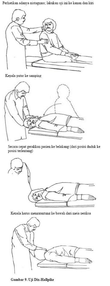 Dari posisi duduk di atas tempat tidur, penderita dibaring-kan ke belakang dengan cepat, sehingga kepalanya meng-gantung 45º di bawah garis horisontal, kemudian kepalanya dimiringkan 45º ke kanan lalu ke kiri. Perhatikan saat timbul dan hilangnya vertigo dan nistagmus, dengan uji ini dapat dibedakan apakah lesinya perifer atau sentral.
