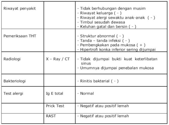 rinitis alergi. Test kulit ( skin test ) biasanya negatif, demikian pula test RAST, serta kadar Ig E total dalam batas normal. Kadang-kadang ditemukan juga eosinofil pada sekret hidung, akan tetapi dalam jumlah yang sedikit. Infeksi sering menyertai yang ditandai dengan adanya sel neutrofil dalam sekret.