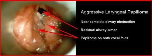 • Bila papiloma cukup besar dapat menyebabkan gangguan pernapasan berupa batuk, sesak, dan stridor inspirasi. Timbulnya sesak merupakan suatu tanda bahwa telah terjadi sumbatan jalan nafas bagian atas dan biasanya diperlukan tindakan trakeostomi