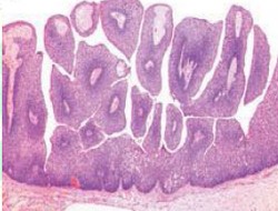 • Gambaran mikroskopik menunjukkan kelompok stroma jaringan ikat dan pembuluh darah seperti jari-jari yang dilapisi lapisan sel epitel skuamosa hiperplastik dengan permukaan keratotik atau parakeratotik. Kadang-kadang muncul gambaran sel yang bermitosis.