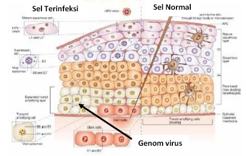 • Human papilloma virus merupakan virus DNA, tidak berkapsul dengan kapsid ikosehedral dan DNA double-stranded. Di dalam sel yang terinfeksi, DNA HPV mengalami replikasi, transkipsi dan translasi menjadi protein virus. Protein ini akan membentuk virion HPV baru yang dapat menginfeksi sel lainnya. Sel yang terinfeksi HPV akan mengalami proliferasi pada lapisan basal.